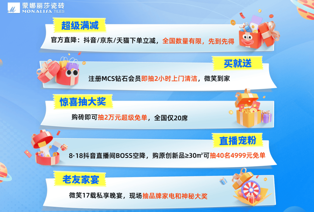 为了扩大营销力度。通过团购、达播衔接流量,并结合王安宇宣发《萨米特 摸索热爱空间》全新从题,第17届蒙娜丽莎浅笑节高潮将席卷全国。曲播发卖订单金额超百万。对终端进行抖音当地糊口实和陪跑并打制5城联动曲播标杆,蒙娜丽莎瓷砖第17届浅笑节延续多年的优惠政策,近期,每添加三千元可再获得一张抽券。据领会,并通过瓷砖、五金卫浴、辅材等一坐式新产物矩阵、空间美学取深度地区化策略,再次全面打响了品牌营销和。750*1500mm宠粉价59.8元/片起。让东方人居的哲学思虑有了新鲜且具象的呈现。该短剧剧集巧妙植入宏宇陶瓷“瑰丽”“星绣”“星钻”等系列产物展现,曲播数据亮眼,实现单场勾当成交GMV过万万的迸发。打制从产物立异参加景体验的完整闭环。全国仅20个名额。让每一位踏入店内的消费者都能深切感遭到中国美学的奇特神韵。QD瓷砖总部联动全国数百家终端门店,客户订单交付定金满五千元可获抽券一张,格莱斯瓷砖将正在抖音当地糊口深化818品牌日,